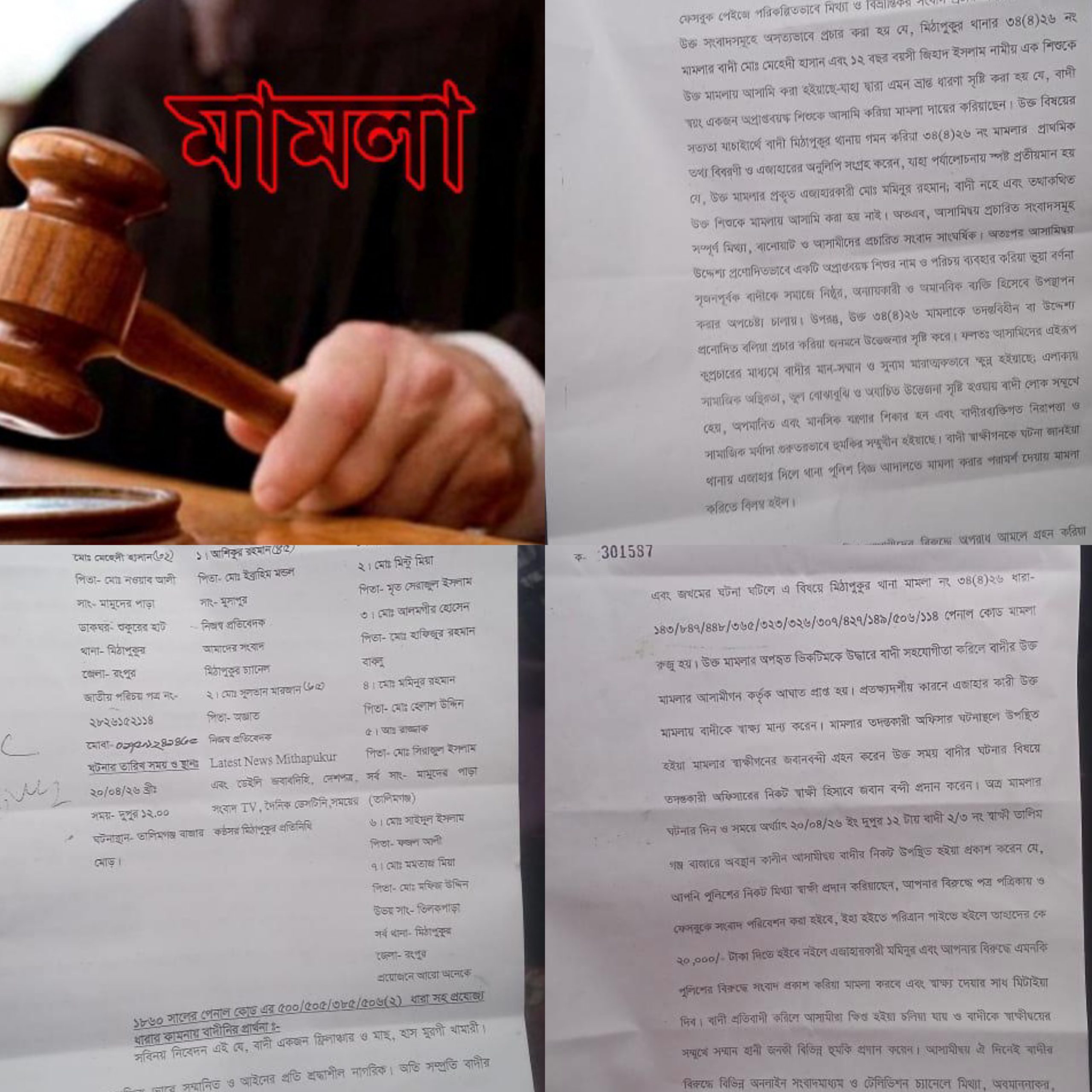 রংপুরের মিঠাপুকুরে মিথ্যা সংবাদ প্রচার এবং চাঁদা দাবির অভিযোগে দুই সাংবাদিকসহ কয়েকটি অনলাইন পত্রিকার বিরুদ্ধে আদালতে মামলা দায়ের করা হয়েছে। গত ২৩ এপ্রিল ২০২৬, বৃহস্পতিবার মিঠাপুকুর সিনিয়র জুডিসিয়াল ম্যাজিস্ট্রেট আদালতে মামলাটি দায়ের করেন স্থানীয় বাসিন্দা মোঃ মেহেদী হাসান।